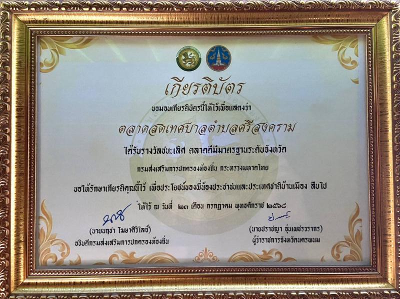 นายธราพงษ์ เรืองวรบูรณ์ นายกเทศมนตรีตำบลศรีสงคราม พร้อมด้วยคณะกรรมการผู้ประกอบการตลาดสดเทศบาลตำบลศรีสงคราม เข้ารับเกียรติบัตร จากนายปราชญา อุ่นเพชรวรากร ผู้ว่าราชการจังหวัดนครพนม รางวัลชนะเลิศ การประกวดตลาดดีมีมาตรฐานระดับจังหวัด กรมส่งเสริมการปกครองท้องถิ่น กระทรวงมหาดไทย ประจำปีงบประมาณ พ.ศ. 2568 ณ ห้องประชุมพระธาตุ ศาลากลางจังหวัดนครพนม(หลังใหม่)