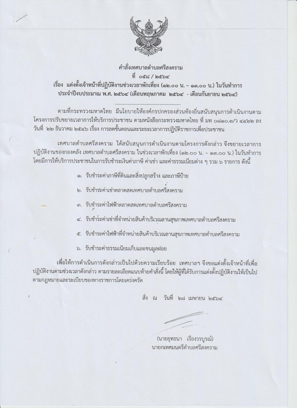 ขยายเวลาปฏิบัติงานกองคลัง ในช่วงเวลาพักเที่ยง (12.00 - 13.00 น.) ในวันทำการ [8 ธันวาคม 2564]
